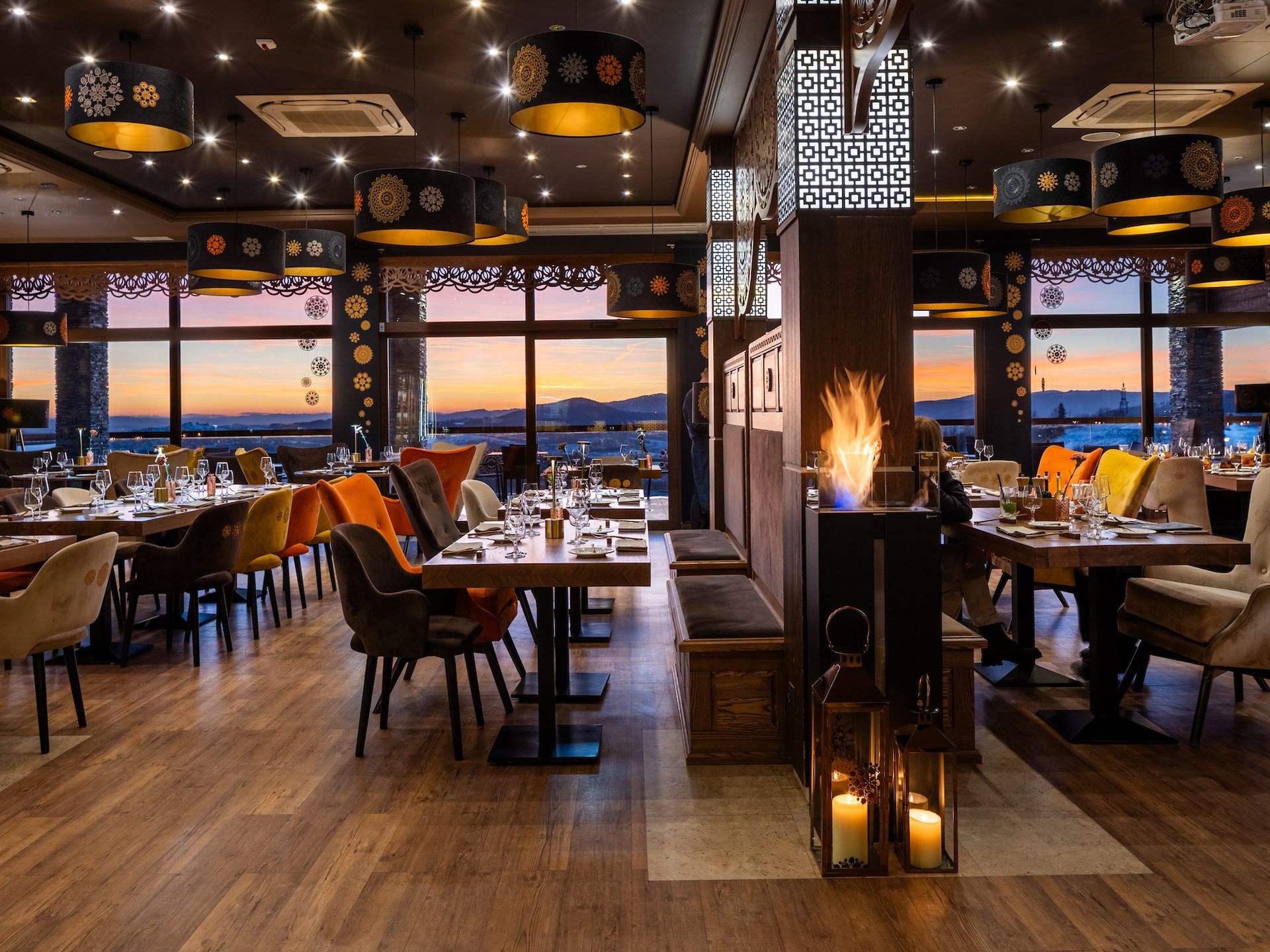 Wnętrza restauracji otwierają się na panoramę Beskidów, gdzie światło gór staje się naturalnym tłem kulinarnego doświadczenia. Elegancka, stonowana przestrzeń, wzbogacona detalami inspirowanymi góralskim rzemiosłem, łączy nowoczesny komfort z autentycznym charakterem miejsca.